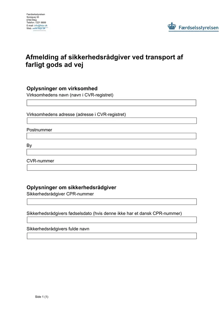 Blanket til at afmelde sikkerhedsrådgiver i forbindelse med transpor af farligt gods.