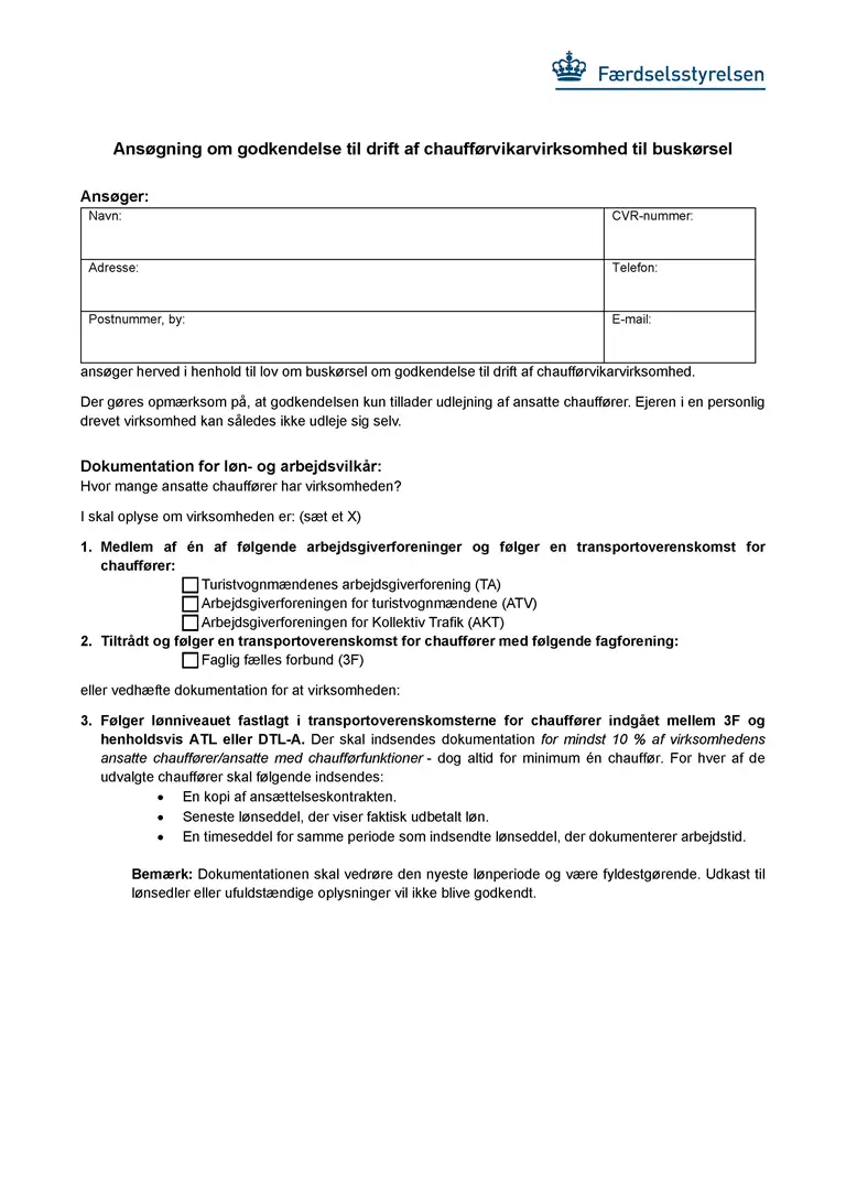 Brug denne blanket når du vil udleje chauffører til national buskørsel og søge om godkendelse til drift af chaufførvikarvirksomhed.