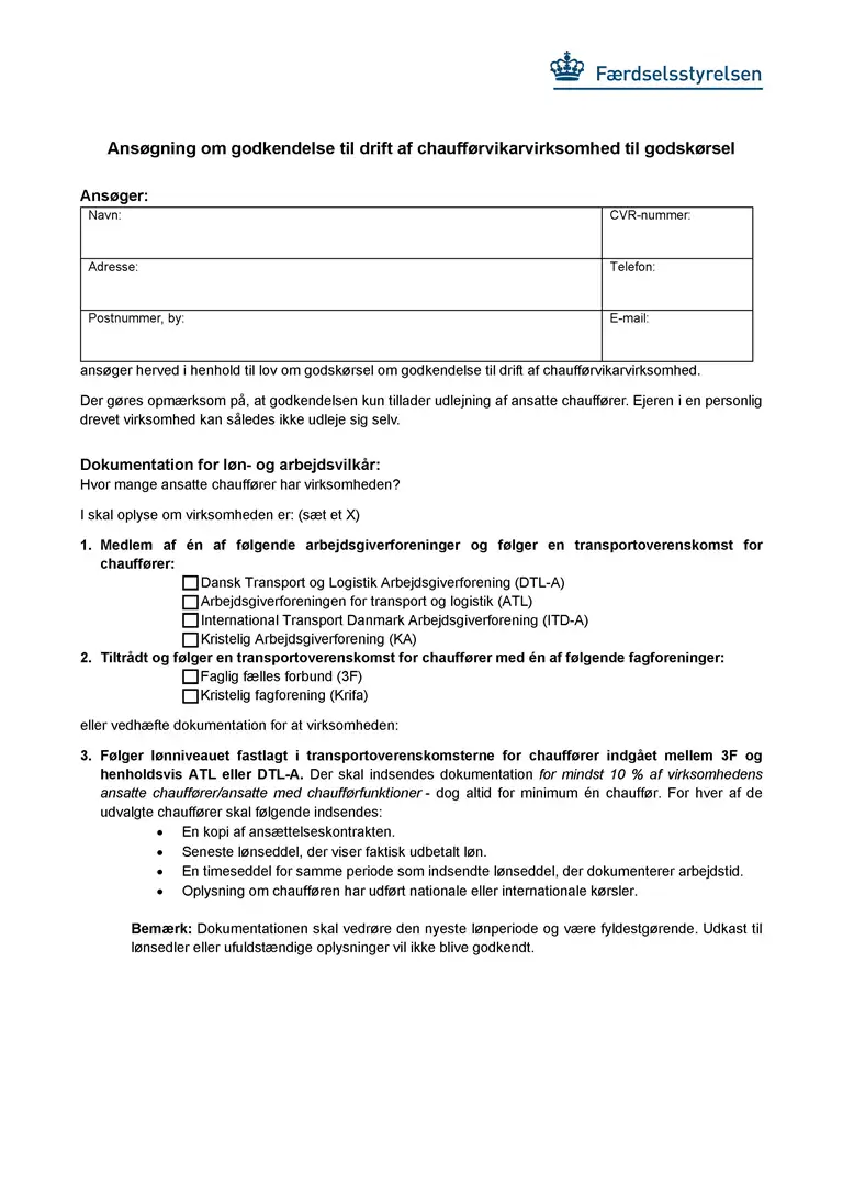Brug denne blanket når du vil udleje chauffører til national godskørsel og søge om godkendelse til drift af chaufførvikarvirksomhed.