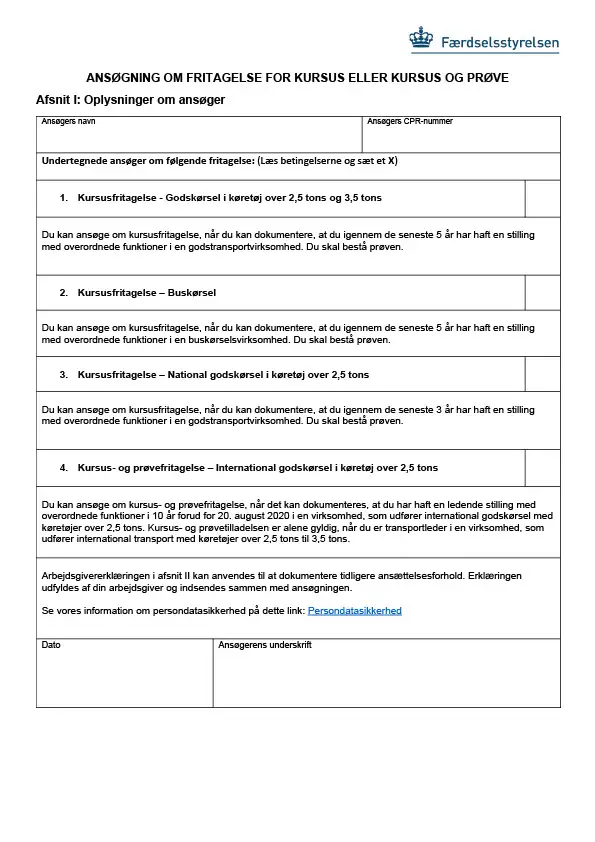 Udfyld ansøgning om kursusfritagelse i afsnit I. Afsnit II skal udfyldes af din arbejdsgiver med oplysninger om din beskæftigelse.