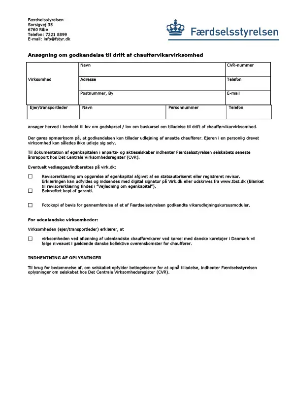 Brug denne blanket hvis du søger om godkendelse til at udleje chauffører erhvervsmæssigt.