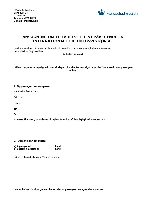 Brug denne blanket når du søger om tilladelse til erhvervsmæssig international lejlighedsvis buskørsel udenfor EØS