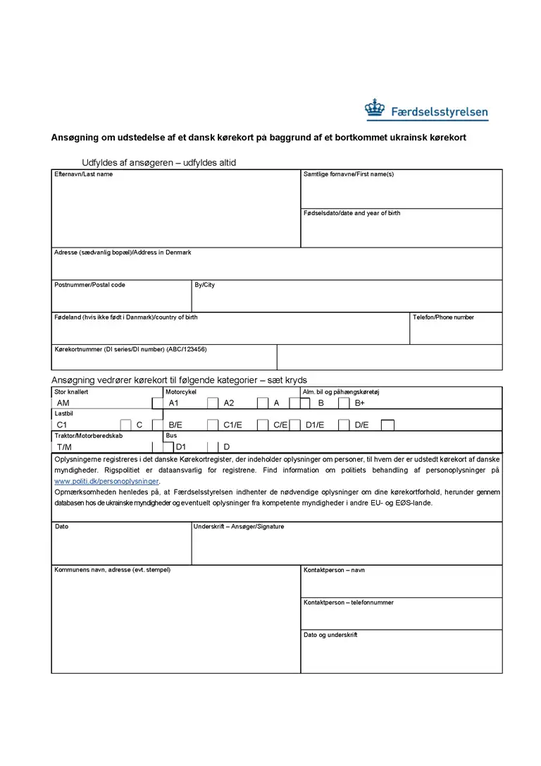 Ansøg om udstedelse af dansk kørekort på baggrund af et bortkommet ukrainsk kørekort