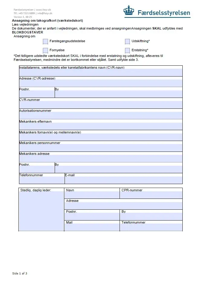Du skal udfylde denne ansøgning, hvis du ønsker at ansøge om værkstedskort, ved aflevering i postkasse på et af de tre lokationer.