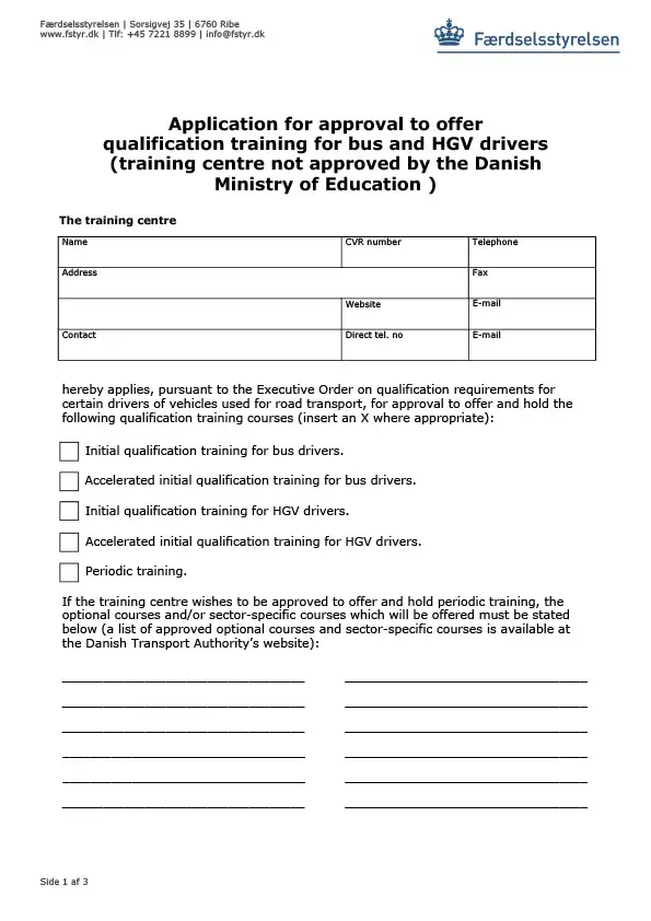 Application for approval to offer qualification training for bus and HGV drivers (training centre not approved by the Danish Ministry of Education).