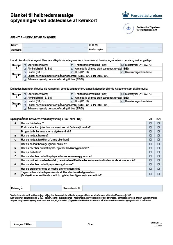 Blanket til helbredsmæssige oplysninger ved udstedelse af kørekort