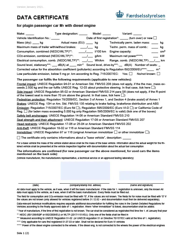 Data certificate for a plugin passenger car M1 with diesel engine