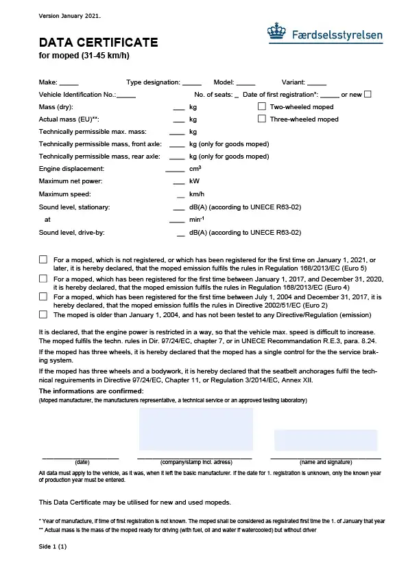 Data certificate for large moped