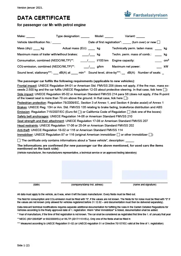 Data certificate for passenger car M1 with petrol engine