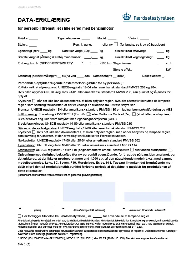 Dataerklæring for personbil med benzinmotor (fremstillet i lille serie) med benzinmotor