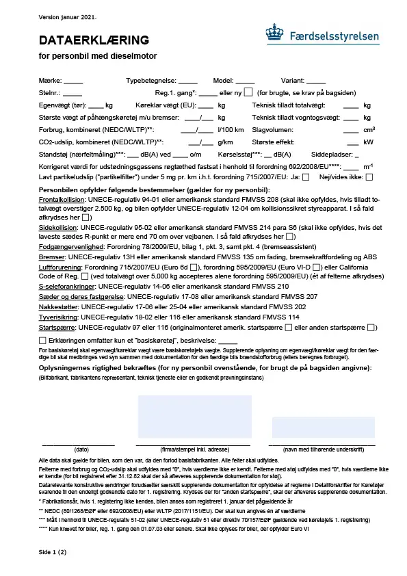 Dataerklæring for personbil med dieselmotor