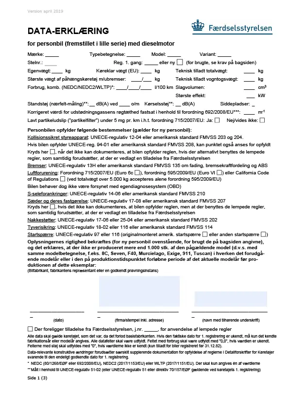 Dataerklæring for personbil med dieselmotor (fremstillet i lille serie)