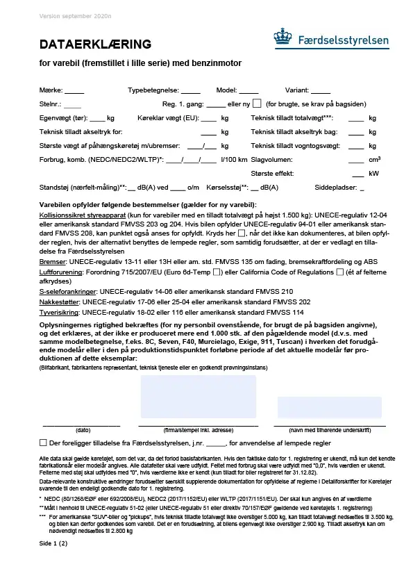 Dataerklæring for varebil med benzinmotor (fremstillet i lille serie)