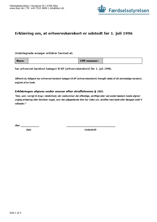 Erklæring om, at erhvervskørekort er udstedt før 1. juli 1996 (taxi)
