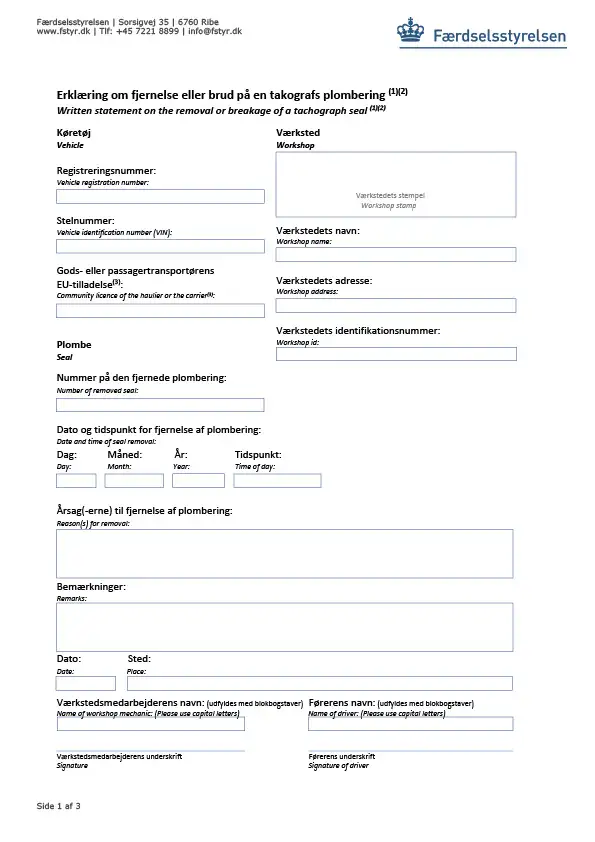 Du skal udfylde denne erklæring, hvis du i forbindelse med reparation eller ændring af et køretøj fjerner eller bryder en takografs plombering.