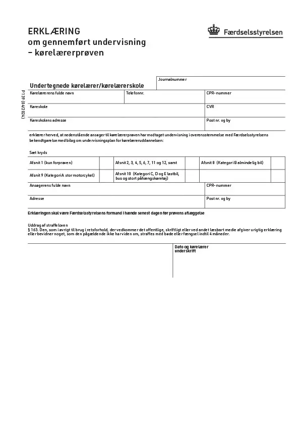Her kan du finde erklæring om gennemført undervisning (P139) til brug for kørelæreruddannelsen.