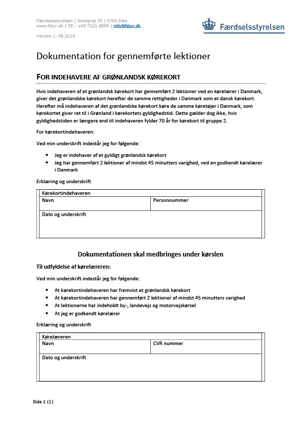 Du skal bruge denne blanket til at dokumentere, at du har gennemført en række lektioner hos en godkendt kørelærer i Danmark, og dit grønlandske kørekort derfor nu giver samme rettigheder som et dansk kørekort.