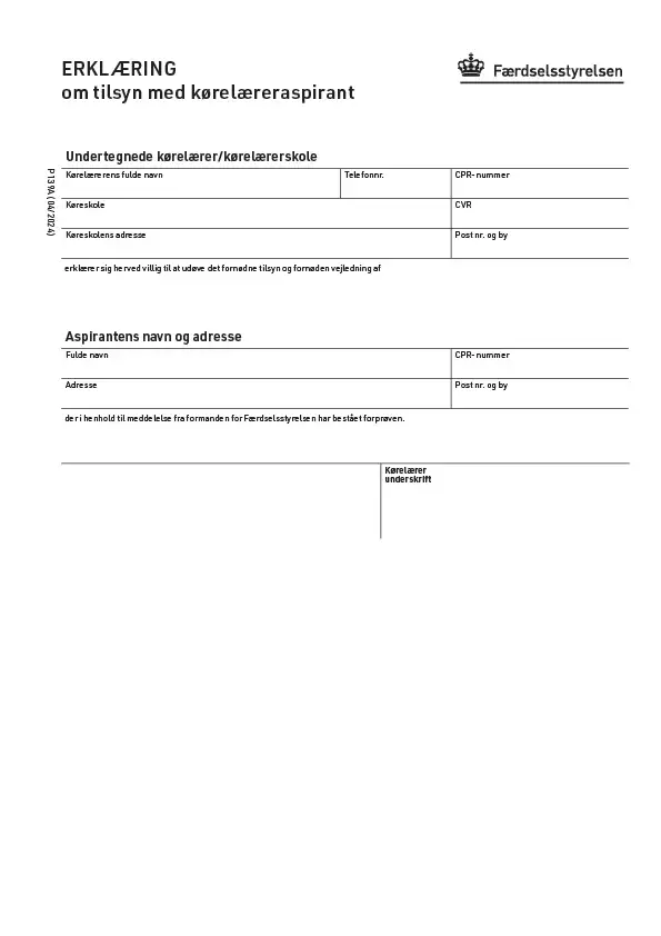 Her kan du finde erklæring om tilsyn med kørelæreraspirant (P139A) til brug for kørelæreruddannelsen.