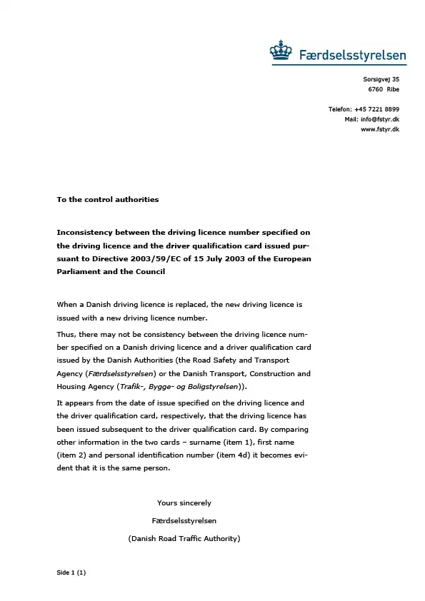 Kørekortnummererklæring til kontrolmyndighederne på engelsk