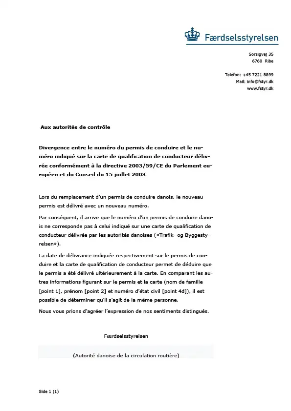 Kørekortnummererklæring til kontrolmyndighederne på fransk