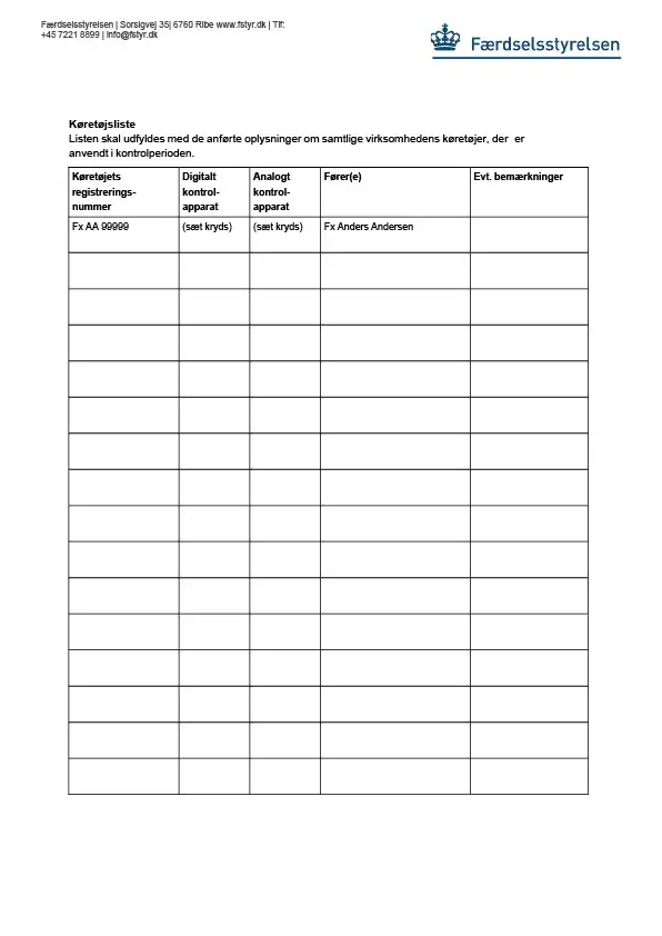 Er du indkaldt til kontrol, kan køretøjslisten udfyldes på virksomhedsportalen med de anførte oplysninger på samtlige køretøjer der har været tilknyttet virksomheden i kontrolperioden, eller du kan benytte denne blanket ved indsendelse.