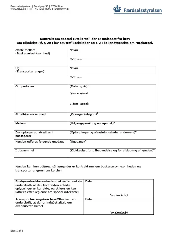 Kontrakt om speciel rutekørsel, der er undtaget fra krav om tilladelse, jf. § 20 i lov om trafikselskaber og § 2 i bekendtgørelse om rutekørsel.