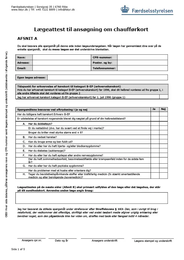 Hvis dette ikke er muligt, ten i en lukket kuvert til Færdselsstyrelsen, Sorsigvej 35, 6760 Ribe, skal du eller lægen sende lægeattest