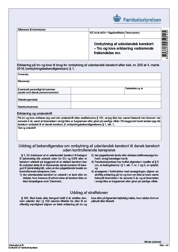 Ombytning af udenlandsk kørekort - Gruppe 1 - Tro og loveerklæring vedrørende frakendelse mv. - kk031