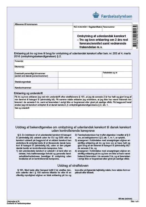 Ombytning af udenlandsk kørekort - Tro og love erklæring vedrørende frakendelse m.v.