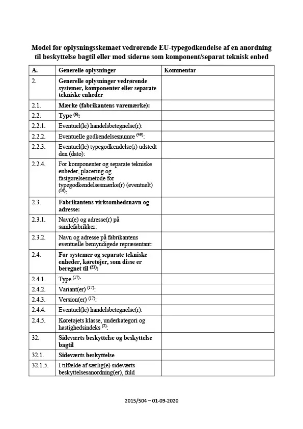Oplysningsskema - EUtype - anordning til beskyttelse bagtil el. mod siderne - komponent - separat teknisk enhed