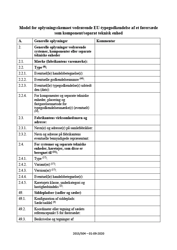 Oplysningsskema - EUtype - førersæde - komponent - separat teknisk enhed
