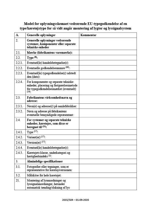 Oplysningsskema - EUtype - lygter og lyssignalsystem