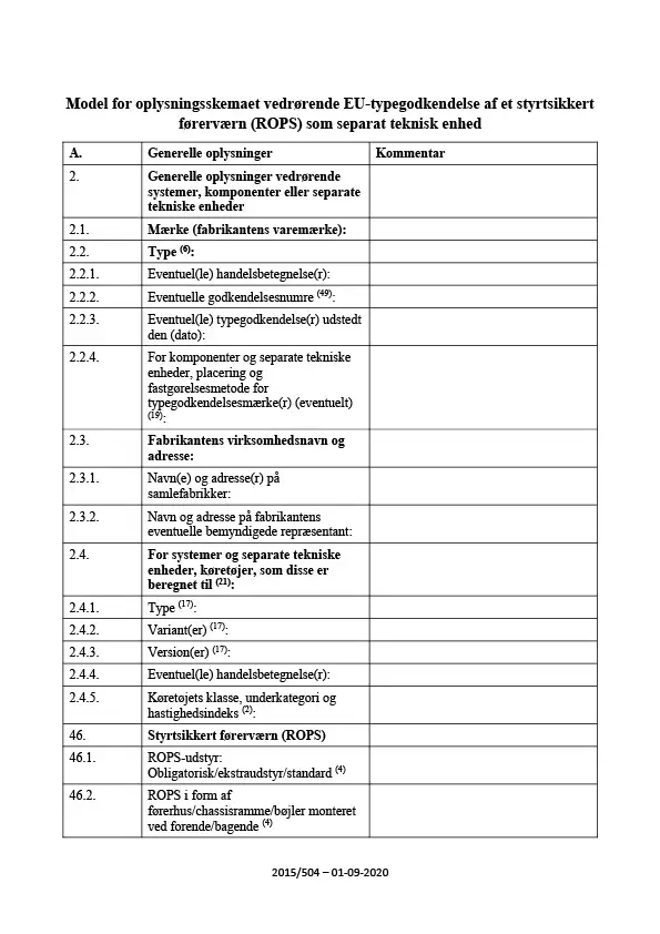 Oplysningsskema - EUtype - ROPS - separat teknisk enhed