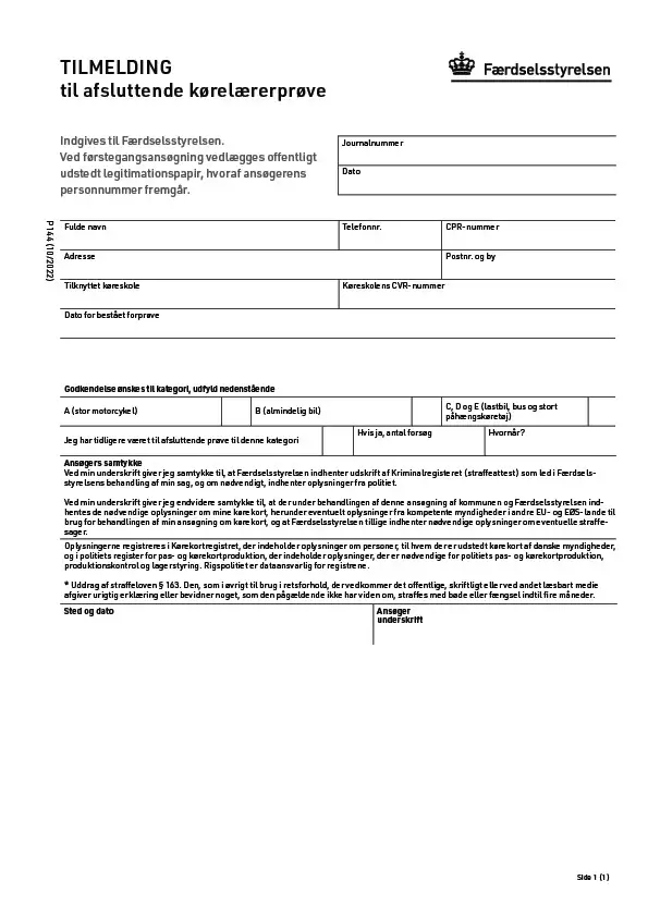 Her kan du finde tilmeldingsblanketten (P144) til den afsluttende prøve for kørelæreruddannelsen.
