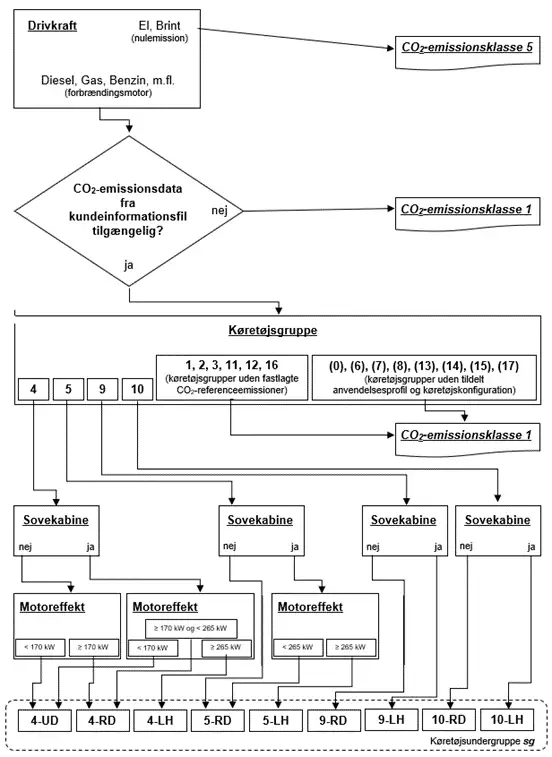 - CO2-emissionsklasse 1 — køretøjer, der ikke tilhører nogen af de CO2-emissionsklasser, der er omhandlet i litra b)-e)