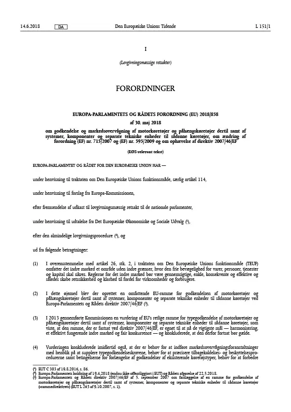 Om godkendelse og markedsovervågning af motorkøretøjer og påhængskøretøjer dertil samt af systemer, komponenter og separate tekniske enheder til sådanne køretøjer, om ændring af forordning (EF) nr. 715/2007 og (EF) nr. 595/2009 og om ophævelse af direktiv 2007/46/EF´.