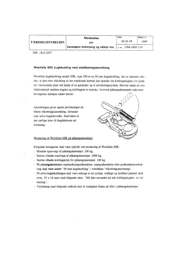 Meddelelse nr 1669 - Westfalia SSK kuglekobling med stabiliseringsanordning - Om køretøjers indretning og udstyr mv.
