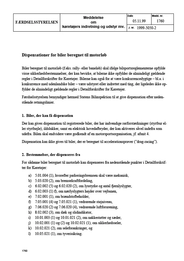 Meddelelse nr 1760 - Dispensationer for biler beregnet til motorløb - Om køretøjers indretning og udstyr mv.