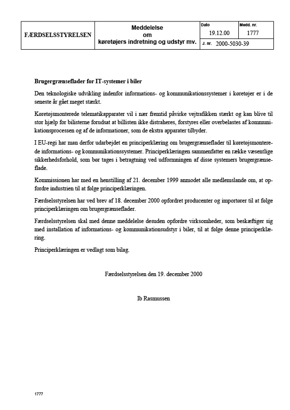 Meddelelse nr 1777 - Brugergrænseflader for IT-systemer i biler - Om køretøjers indretning og udstyr mv.