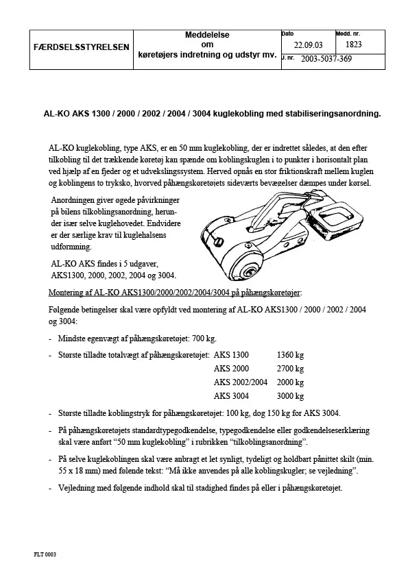 Meddelelse nr 1823 - AL-KO AKS 1300 2000 2002 2004 3004 kuglekobling med stabiliseringsanordning - Om køretøjers indretning og udstyr mv.