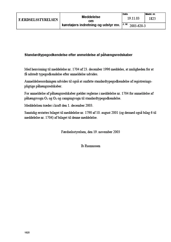 Meddelelse nr 1825 - Standardtypegodkendelse efter anmeldelse af påhængsredskaber
