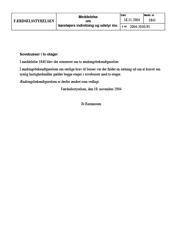 Meddelelse nr 1841 - Sovebusser i to etager - Om køretøjers indretning og udstyr mv.