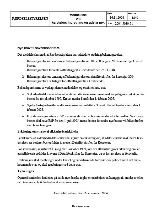 Meddelelse nr 1840 - Nye krav til sovebusser m.v. - Om køretøjers indretning og udstyr mv.