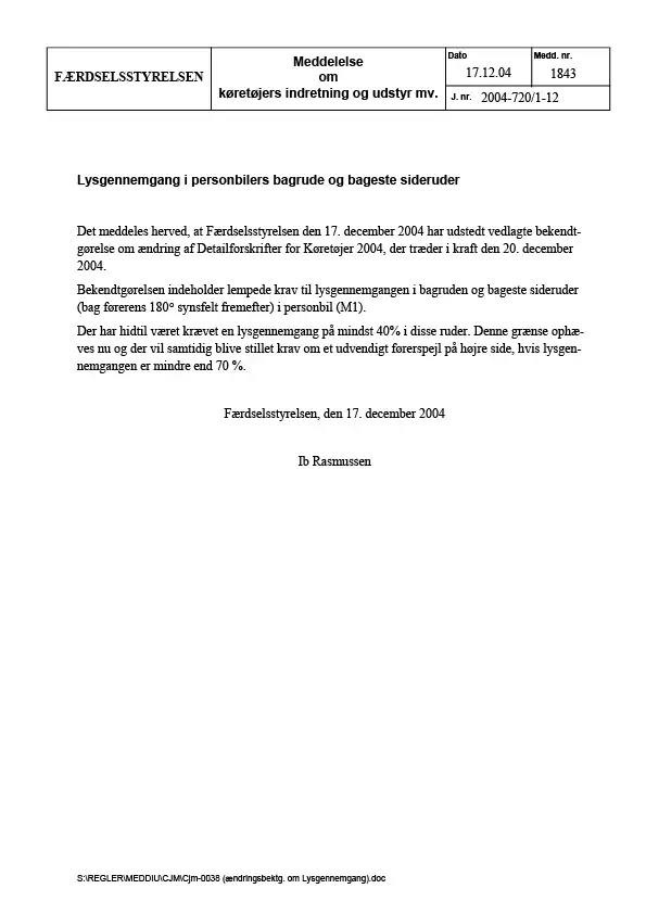 Meddelelse nr 1843 - Lysgennemgang i personbilers bagrude og bageste sideruder - Om køretøjers indretning og udstyr mv.