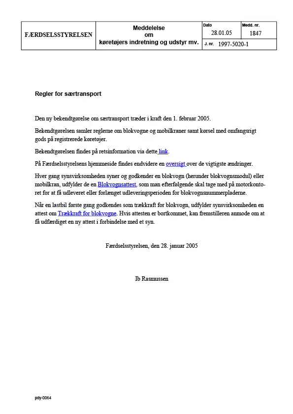 Meddelelse nr 1847 Regler for særtransport - Om køretøjers indretning og udstyr mv.