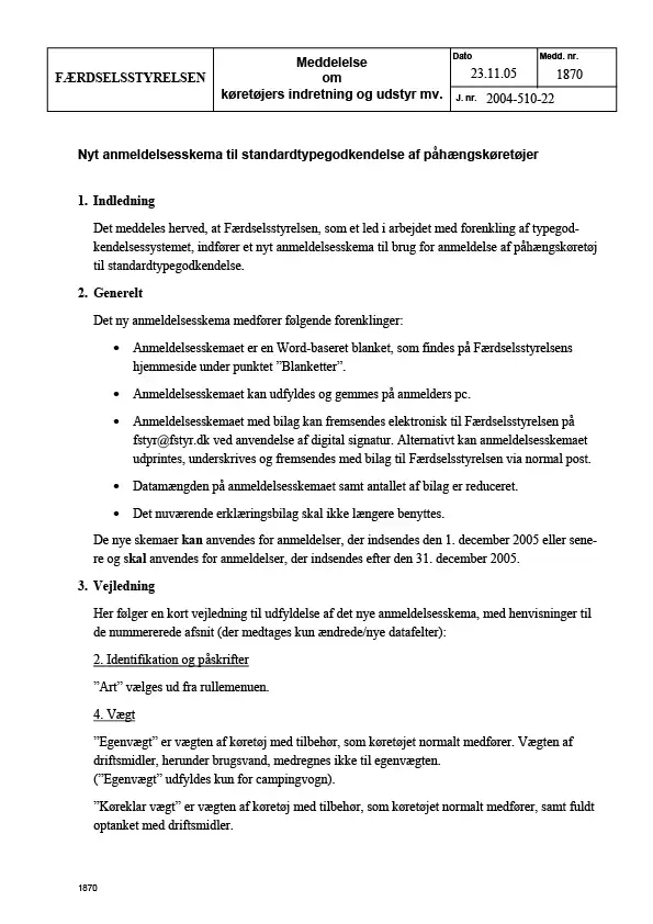 Meddelelse nr 1870 - Nyt anmeldelsesskema til standardtypegodkendelse af påhængskøretøjer - Om køretøjers indretning og udstyr mv.