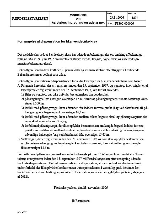 Meddelelse nr 1891 - Forlængelse af dispensation for bl.a. vendecirkelkrav - Om køretøjers indretning og udstyr mv.