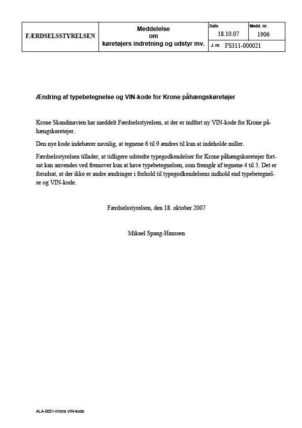 Meddelelse nr 1906 - Ændring af typebetegnelse og VIN-kode for Krone påhængskøretøjer - Om køretøjers indretning og udstyr mv.
