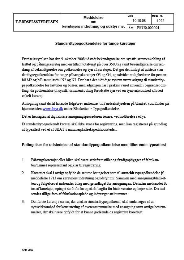 Meddelelse nr 1922 - Standardtypegodkendelse for tunge køretøjer - Om køretøjers indretning og udstyr mv.