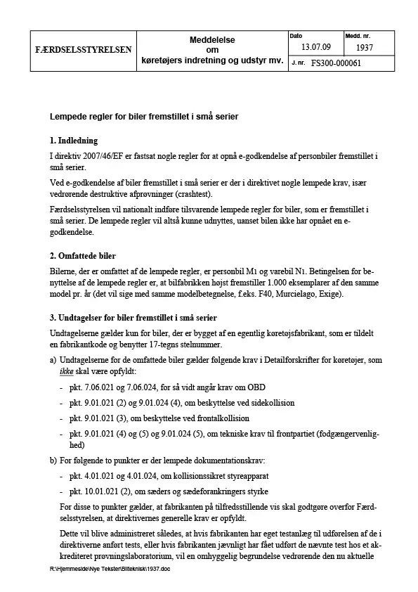 Meddelelse nr 1937 - Lempede regler for biler fremstillet i små serier - Om køretøjers indretning og udstyr mv.